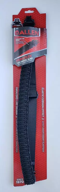 This Allen sling uses the traditional weave found in paracord slings but uses a cording that contains elastic. The resulting product gives the cushion effect of a Neoprene sling. Two Swivels are used on this sling, making it an easy replacement for the sling on your favorite rifle or shotgun.