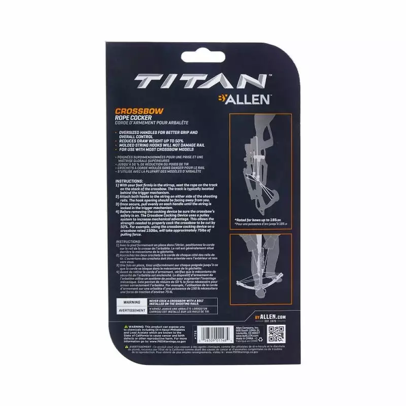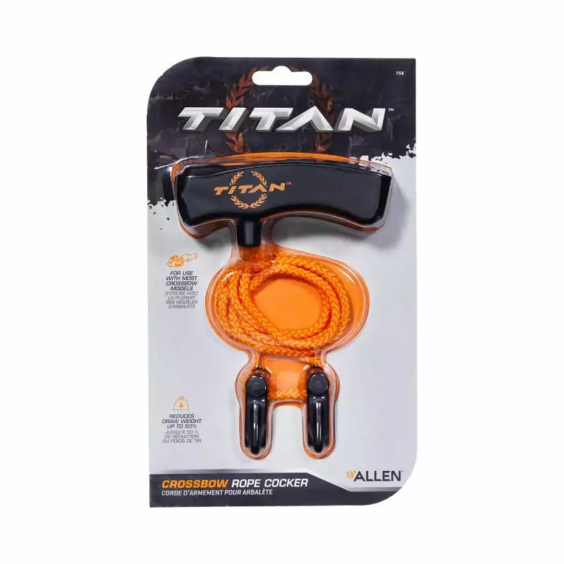 Whether you want to save your hands, or you need a bit of help cocking your crossbow, the Titanâ„¢ Crossbow Cocking Rope by Allen is easy to use and reduces draw weight by up to 50%. Features oversized handles for better grip and control, plus it helps ensure that your bow is evenly cocked, which increases accuracy.