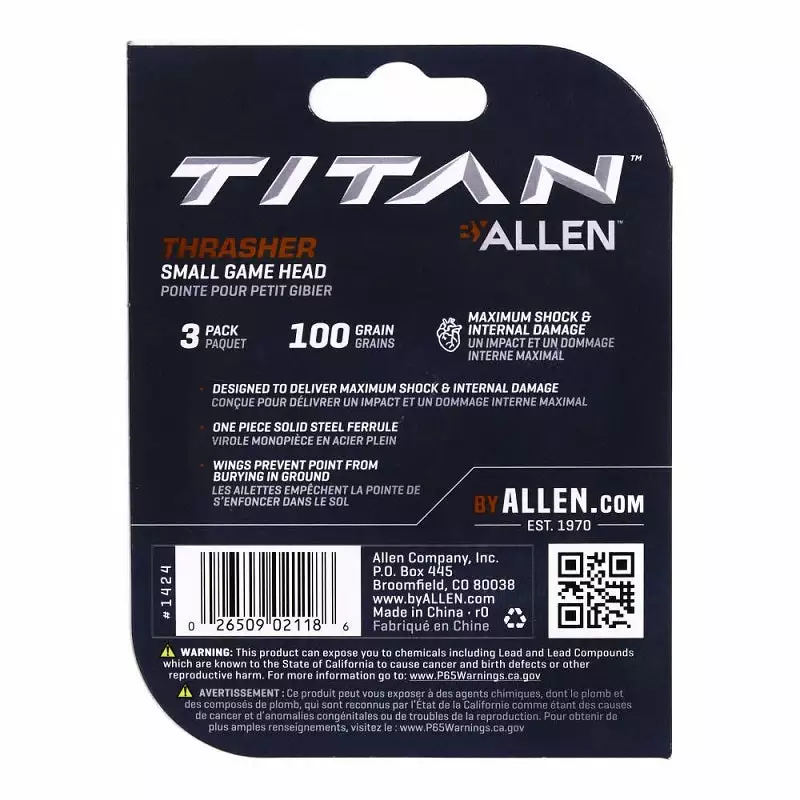 The Thrasher Small Game Head by Allen is designed to deliver maximum shock and internal damage to the game such as rabbits and squirrels. The one-piece solid steel ferrule combines with “wings” that prevent the point from burying into the ground to create a dependable, essential hunting tip for small game.