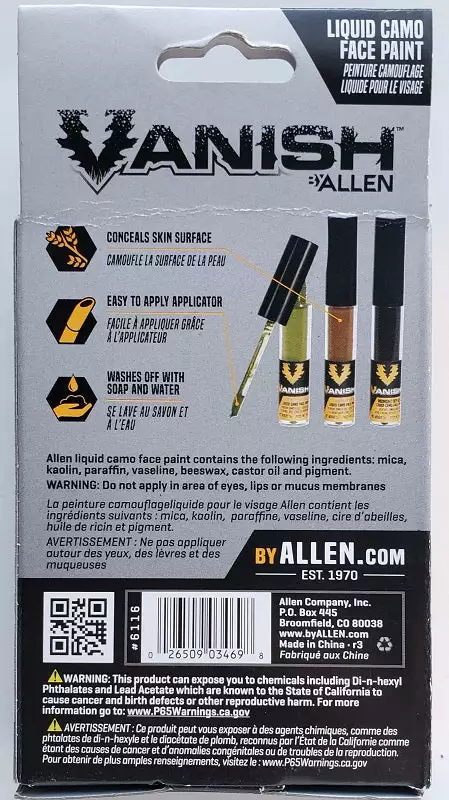Vanish™ Liquid Face Paint comes with three 2 oz bottles in brown, green, and black. Each bottle includes an applicator allowing for detailed face paint application. The face paint washes off easily with soap and water. Make-up quality face paint with applicator brush that makes face camo much easier.