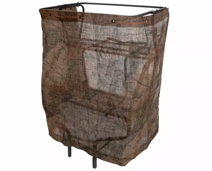 The Vanish™ Quick Set Blind Rig is an 8-foot wide x 50-inch tall section of burlap made in Mossy Oak® Break-Up Country™ that is bound with a durable cotton blend fabric, then grommeted. A durable cord is then threaded through the grommets. The final assembly makes a very versatile blind that can cover treestands or be tied between two trees to make an instant blind.