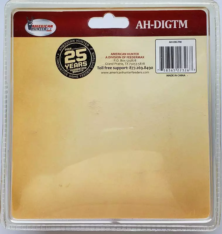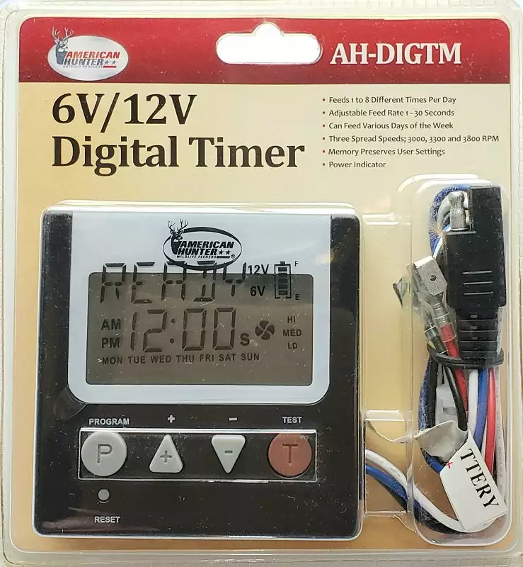 The American Hunter 6/12V Digital Timer allows you to manage of how and when you feed. Set up to 8 different feed times a day with the adjustable feed rate while also setting exactly which days of the week to feed. Simple set up and easy to use programming make the flexible 6/12V Digital Timer an smart choice to control your feeders.
