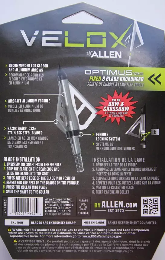 Allen Velox Optimus 125 Fixed 3 Blade Broadhead 14625