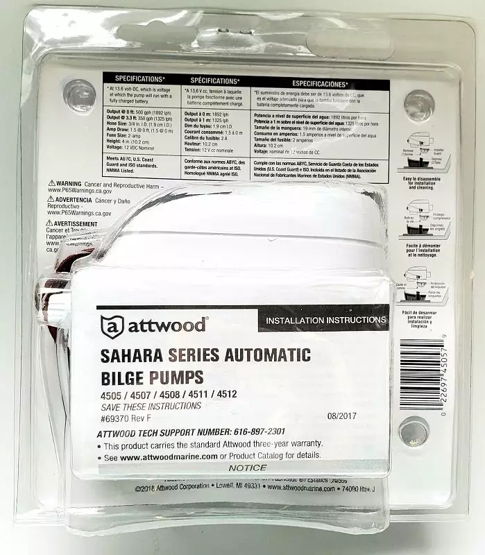 An automatic-switch bilge pump is a requirement for any vessels 20’ and over with sleeping accommodations, but is a great convenience for any size boat. The Sahara has everything contained in one compact yet durable package – pump, wire, seals, strainer, and mercury-free switch –and installs quickly and easily in tight spaces. Pumps include 36” lengths of 16-gauge caulked and tinned copper wire.