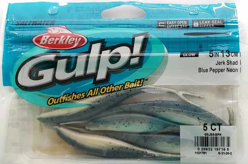 The Berkley Gulp! 5 Inch Jerk Shad are the perfect live bait replacement. Gulp! has 400 times more scent dispersion than ordinary plastic bait. The extreme scent dispersion greatly expands the strike zone allowing you to catch more fish!
