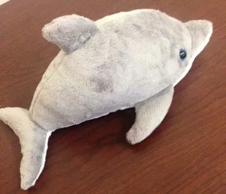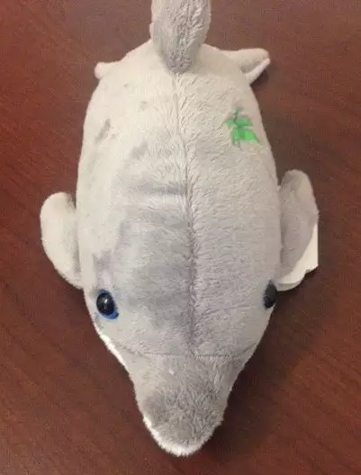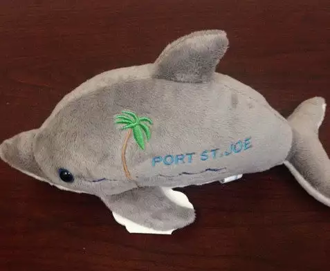 Soft and plush dolphin toy, palm tree, waves and Port St. Joe on one side, 12 inches long.