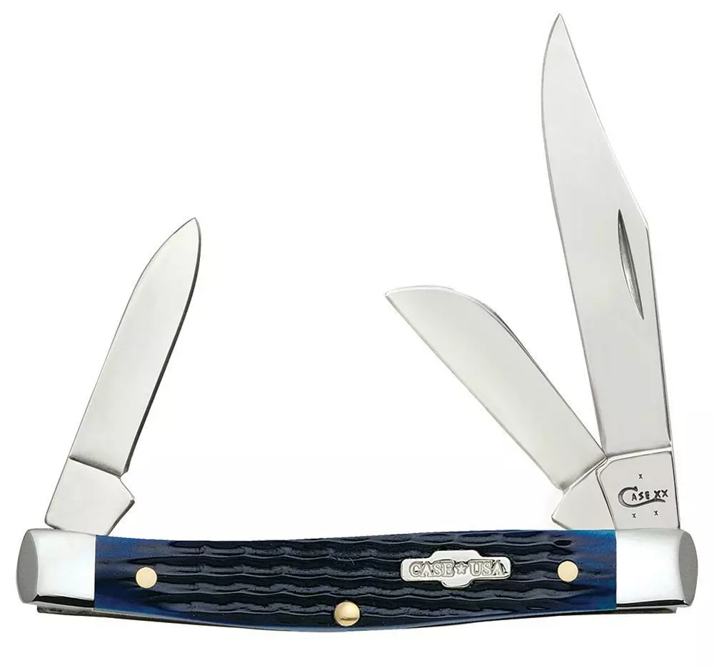 The Case Knife Blue Bone Stockman packs three blades in a convenient but very practical pocket knife. The Clip blade is commonly used as a multi-purpose blade and preferred for detail work. The Sheepfoot blade allows for added strength at the point making it great for carving and achieving a clean cut. The Pen blade is great for light work.