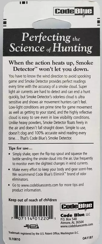 You have to know the wind direction to avoid spooking game and Smoke Detector provides perfect readings every time with the accuracy of a smoke cloud. Super light air currents are hard to detect and can end a hunt quickly but Smoke Detector’s odorless cloud is ultra sensitive and shows air movement hunters can’t feel. Low-light conditions are prime time for game movement as well as getting to your stand and the highly reflective cloud is easy to see even in low visibility conditions. Unlike heavy powders Smoke Detector floats freely in the air and doesn’t fall straight down.