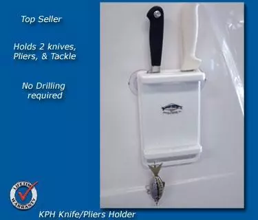 Fisherman’s storage solution, compact design holds 2 knives in covered slots, pliers, and up to 20 hooks, lures, and rigs in 9 holes and 4″ slot on bottom of unit. It is suction cup mounted so holes to drill. Constructed of 100% marine-grade polymer.