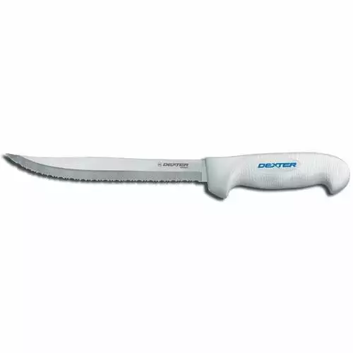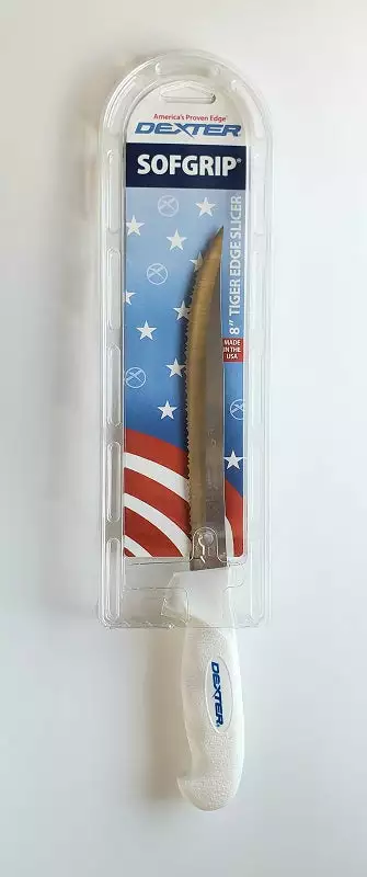 The Dexter SG142-8TE legendary Tiger Edge scalloped cuts through fresh and frozen bait, scales and can fillet a fish with ease. Itβs a great all-around knife for bait, cutting cartilage and help processing your fish. It features our SOFGRIP handle that is soft to the grip and provides great control along with slip resistance. It features our proprietary high carbon, high alloy, stain free DEXSTEEL. This model does not include a sheath.