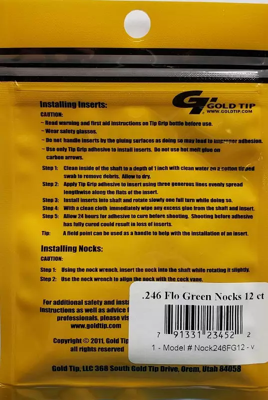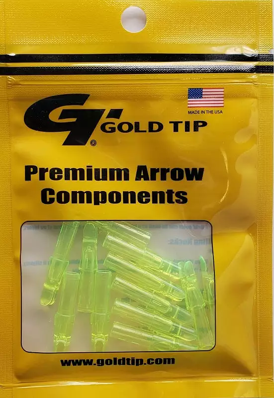 GT .246 Series nocks fit directly into .246 inside diameter arrows or arrows with .246 nock bushings installed. Gold Tip nocks are manufactured from 100% virgin materials, yielding the toughest and straightest nocks in the industry.