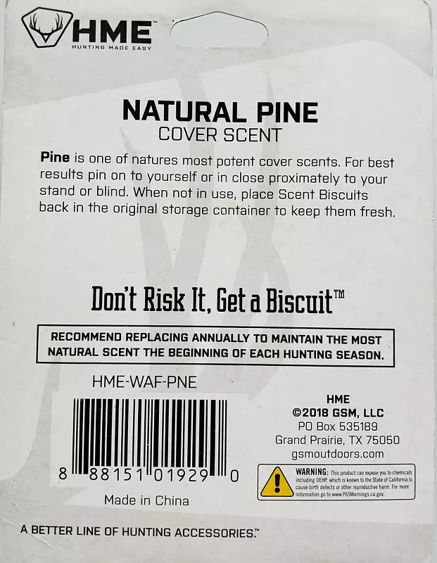 Pine is one of the most potent cover scents. For best results pin on to yourself or in close proximately to your stand or blind. When not in use, place Scent Biscuits back in original container to keep fresh. HME Scent Biscuits are available in a wide variety of scents. Scents come with hangers so you can attach nearly anywhere. Reusable when biscuits are stored in their air tight container.