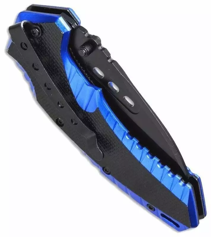 The Boker Magnum 01RY886 Cobalt Strike Folder Folding Knife is a full sized knife that is sure to attract attention with its vibrant color and unique shape. The spring assisted 440A stainless steel blade has a black coating, and the handle boasts an attractive combination of black and “nuclear blast blue”. Also features a sturdy liner lock mechanism, pocket clip and lanyard hole.