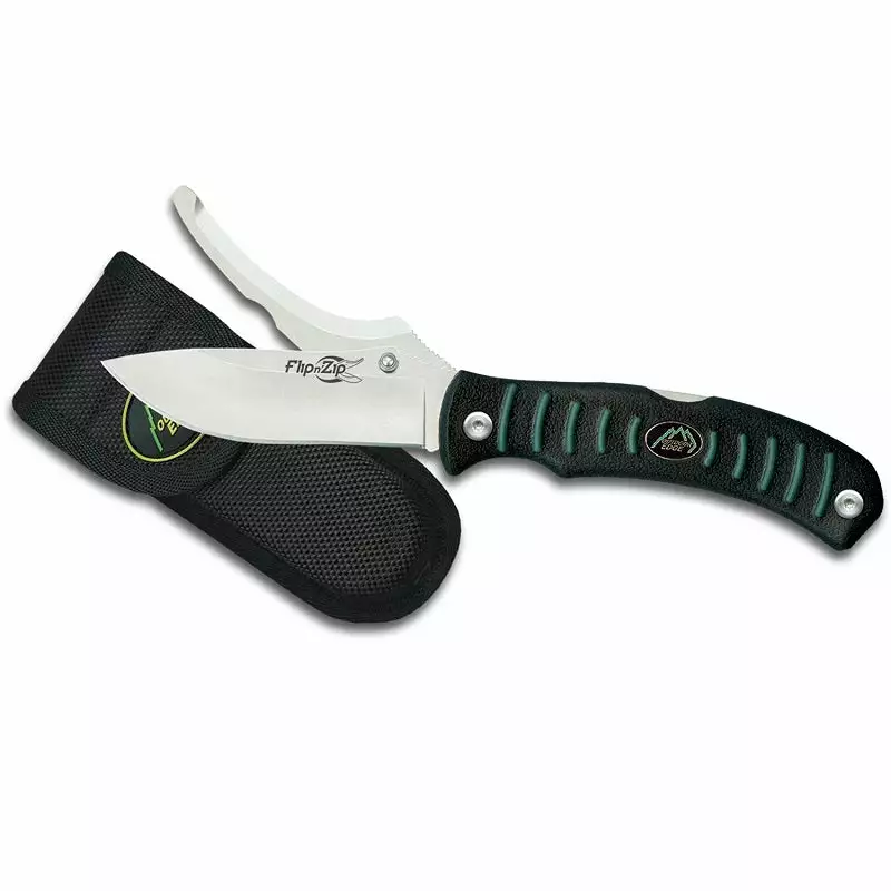 Constructed with high quality materials and craftsmanship for years of reliable service. Each blade is hand finished shaving-sharp from 8Cr13MoV stainless steel for superior edge retention and performance. The rubberized Kraton handle with Traction Slots ensures a secure, non-slip grip. Thumb studs on both skinning and gutting blades allow easy one hand opening and each blade locks independently. The Flip n’ Zip comes complete with durable nylon sheath with H-style belt loops for vertical or side carry. The knife uses a standard lockback. To unlock, simply push down on the lock release in the handle center and close the blade with the other hand. The “Gut Blade” uses a side releasing liner-lock on top the handle. Release the lock by pushing the serrated liner to the right with the thumb and close the blade with the other hand.