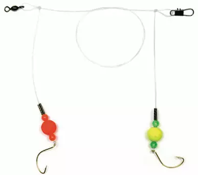 Circle Hook 2 Drop Double drop circle hook rigs featuring Laser Sharp by Eagle Claw circle hooks. SKP2 model has # 2 circle hooks with red and yellow floats.Â