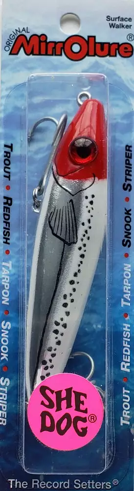 Molded from “space age” plastic media, the She Dog features twin “sonic fish calling” rattles. She emits a high frequency sound which enrages gamefish into monstrous strikes. Great “walk-the-dog” action which anyone can master. Higher buoyancy and sound frequency. Both freshwater and saltwater game fish find this lure irresistible.Â