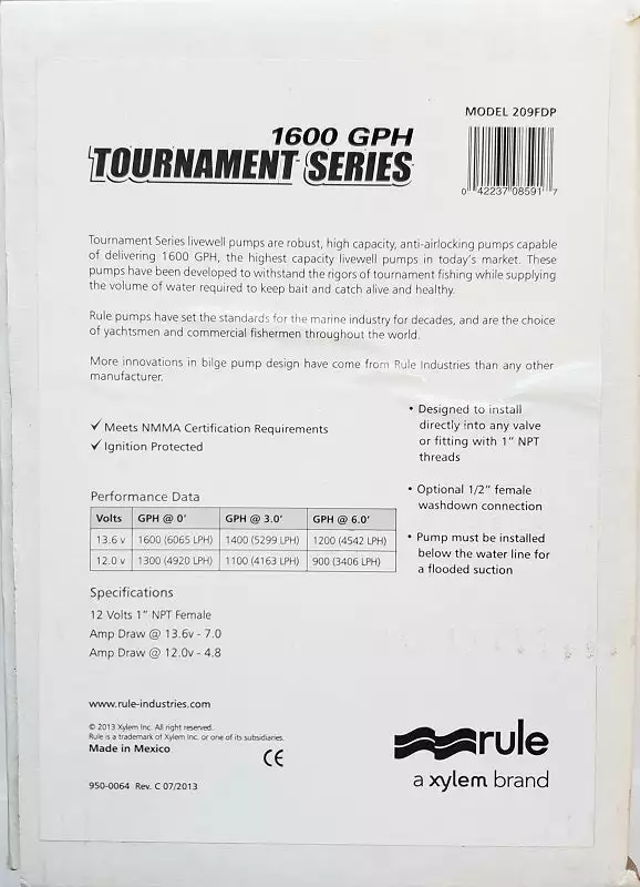 Designed for the toughest applications, this 1600GPH (6056 L.P.H.) Tournament Series pump is one of the highest capacity 12V DC livewell pumps on the market. The Dual Port Pump (209FDP), with a glass-filled nylon base, allows connection to a washdown pump. It also has an anti-airlock feature and a quiet, heavy-duty long life motor. This pump has been developed to withstand the rigors of tournament fishing while supplying the volume of water required to keep bait and catch alive and healthy.