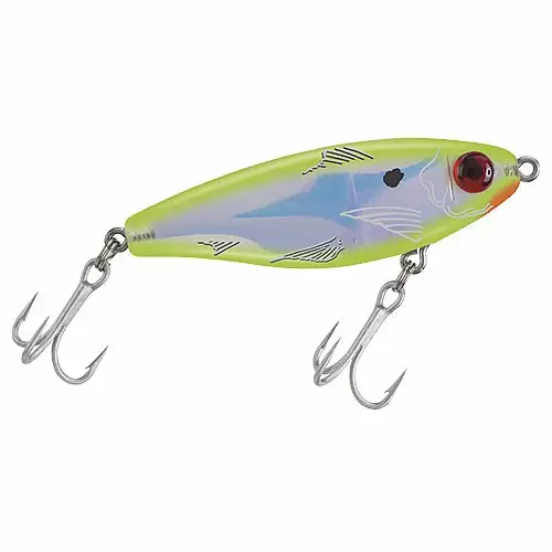 The XL wide body profile and realistic baitfish pattern produces violent strikes. Features bright, reflective, luminescent inserts, “fish calling” rattles and natural 3-D eyes to enhance their realism, plus extra strong hooks. With a twitching retrieve, these baits dart from side-to-side, mimicking a wounded baitfish. Great for Trout, Redfish, Snook, Striped Bass and Tarpon.