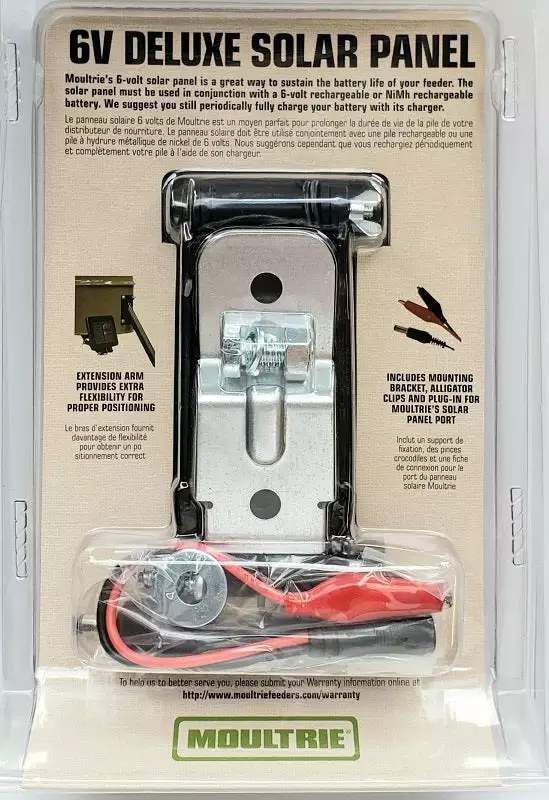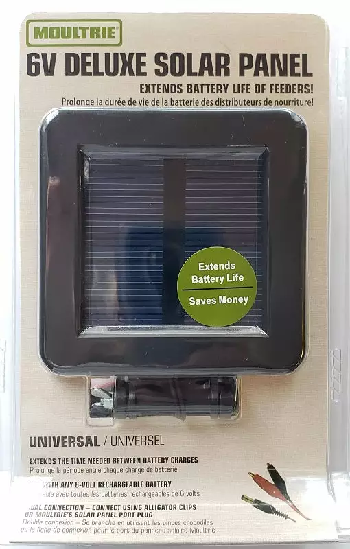 Avoid changing your feeder’s batteries frequently by trying a Moultrie® 6-Volt Deluxe Solar Panel. Redesigned connectors let you plug this solar panel into any 6-volt-battery-powered feeder, and retrofitted alligator clips let the panel work with feeders made before June 2007. Trickle-charging maintains battery life and prevents overcharging, so your battery stays good for years and years.