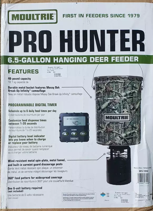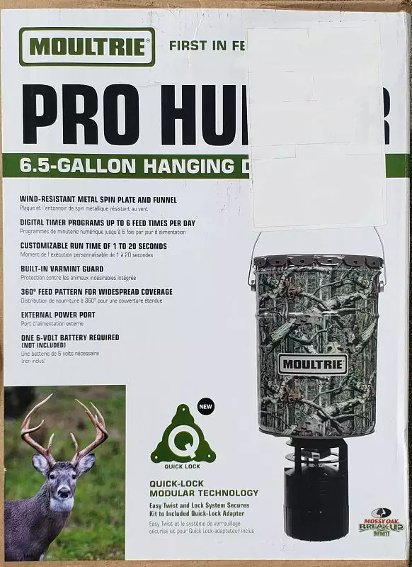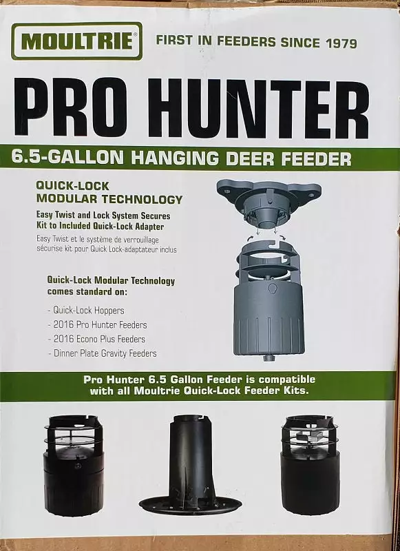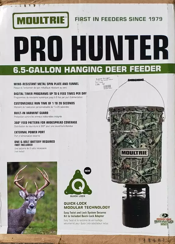 ๏ปฟWanted feeders on your property but hesitant about theย cost?ย It’s timeย to upgrade upย to Moultrie’s 6.5 Gallonย Pro Hunterย Hanging Feederย for both functionality and economy. The low price makes it affordable to outfit your entire property with feeders. Establish for months ahead of the hunt and keep the action hot around your deer feeders at the desired times. The highly programable digital timer allows you to set precise feed times and establish patterns that best fit your needs. Moultrie’s Quick-Lock system allows the broadcaster to be installed or removed from the feed barrel instantly.