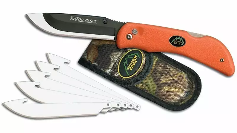 Outdoor Edge’s innovative replacement razor blade system is the solution for dull knives. You can sharpen the blade or simply push the lock button to remove and insert a shaving-sharp new one. Rubberized handles ensure a secure, non-slip grip and are available in black and blaze-orange. Each knife comes complete with 5 replacement blades and nylon sheath.