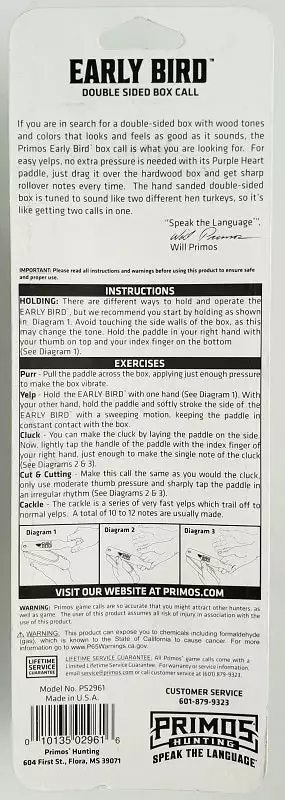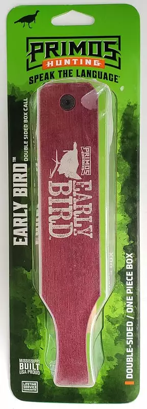 Primos Early Bird Box Call is a double-sided box, creating tones only Purple Heart can offer, that look and feel as good as it sounds. Purple Heart is one of the most durable and sturdiest woods in the world. Not only is it exotic and rare due to its beautiful color, but is also water resistant. For easy yelps, no extra pressure is needed with its paddle, just drag it over the hardwood box and get combination of thick lows, and sharp high notes every time. This box call, sanded by hand, turns into two different hens, so it’s like getting two calls in one.
