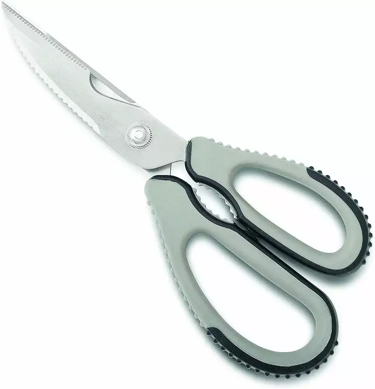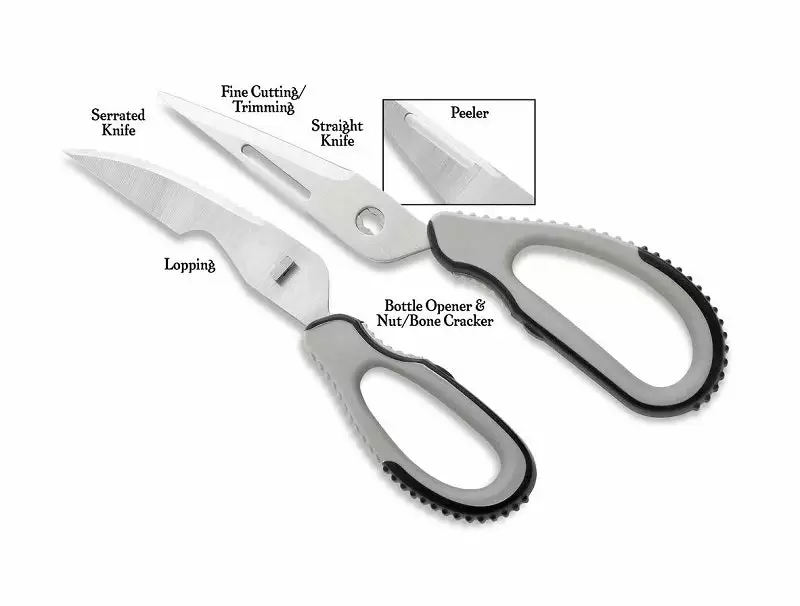 One tool for a multitude of cutting tasks. Shears are great for heavy leverage lopping to fine detail trimming. Includes straight knife and serrated knife/fish scaler, bottle opener/bone cracker and vegetable peeler. 2-piece design allows for easy cleaning. Oversize grip is ideal size for large hands or working with gloves on.