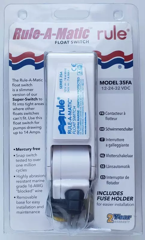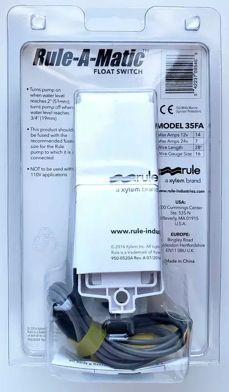 Dependable Silver Tin Oxide contacts have replaced the mercury used in the previous generation of this switch. It features a larger float for increased buoyancy, and a convenient snap-in base that allows easy switch removal for cleaning or inspection. A resilient rubber grommet provides strain relief to the sealed wiring that now exits from the top to keep it dry. With in-line fuser holder.