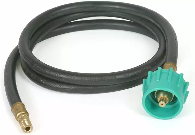 Camco’s 36″ Pigtail Propane Hose Connector is designed to connect a propane cylinder to an RV or trailer propane regulator. It has a ACME nut x 1/4″ inverted male flare. It is rated for 200,000 BTUs per hour. Safety features include thermal protection in case of fire and excess flow protection in case of broken gas line. You can use the pigtail hose with a 20 lb or 30 lb refillable propane tank and connect it to a regulator or 4-Port Brass Tee. It can also be used to connect to an installed 4-Port Tee as an auxiliary propane supply.