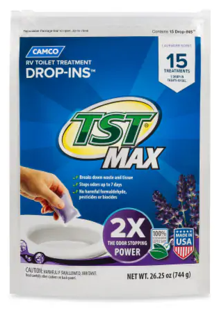 TST MAX RV Toilet Treatments help control unwanted odors and break down waste and tissue in your black water holding tank. The easy-to-use toilet treatments contain a special chemical that helps break down waste. A blend of lavender-scented surfactant oils trap unwanted odors in your tank, making your camping experience more enjoyable. The toilet treatments are RV and marine-approved, non-formaldehyde, and safe for all septic tanks. They’re even great for portable camping toilets. One drop-in treats up to 40 gallons.