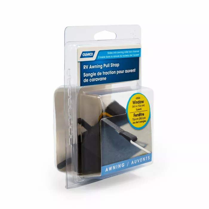 Pull your RV’s window awning out with ease. Camco’s RV Awning Pull Strap slides into your RV awning’s roller bar channel and can stay there for storage to have an easy way to roll your awning out or retract every time. The rubber loop end makes it easy to use with your awning wand. Comes in a pack of two and each strap is 28.5 inch long.