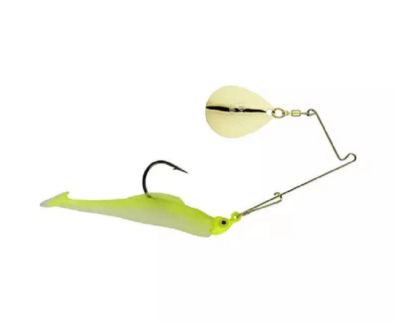 Features: Large 3D eyes, an oversized saltwater black nickel needlepoint hook, gold plated swivel and split rings, heavy gauge gold plated stainless steel ”R” bend wire and 24k gold #4 Colorado blade. Matched with a Glass Minnow soft bait made from a revolutionary, tear-resistant material that is soft, flexible, durable and provides unequaled swimming action.