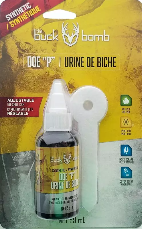 Buck Bomb Synthetic Doe āPā W/Wicks – 2 Ounces – For areas where natural urine scents are not allowed, Buck Bomb Synthetic Doe āPā imitates urine collected from young does and fawns. The same urine found in Buck Bomb aerosols, Synthetic Doe āPā boosts the drawing power of your mock scrapes, particularly during early bow season and then again during post-rut as a natural cover scent and attractant for both bucks and does. The easy-to-use dropper bottle contains premium Doe āPā liquid urine attractant perfect for use with the Buck Bomb Detonator retractable scent wick (sold separately) or the included spike wicks.
