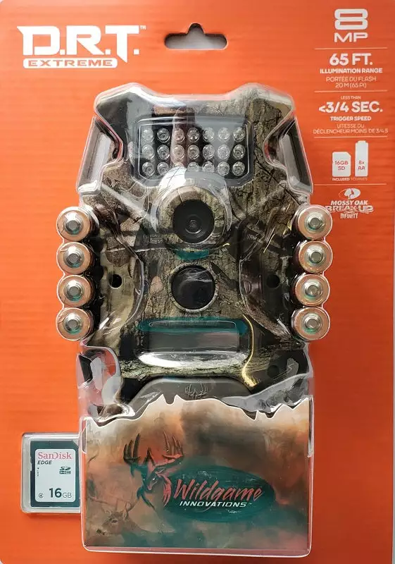 Wildgame D.R.T. Extreme Camera Combo Pack is an 8 MP infrared trail camera that is easy to operate. Includes 8AA batteries and one 16GB memory card.