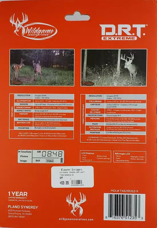 The DRT is a simple to use camera that just has the features and functions a trail camera needs to get the job done. No extra bells and whistles that are confusing and causes the expense of a camera to increase. The D.R.T. Extreme camera has is an 8MP infrared trail camera with video capabilities. Time and date is stamped on each image so you know when your buck is passing through.