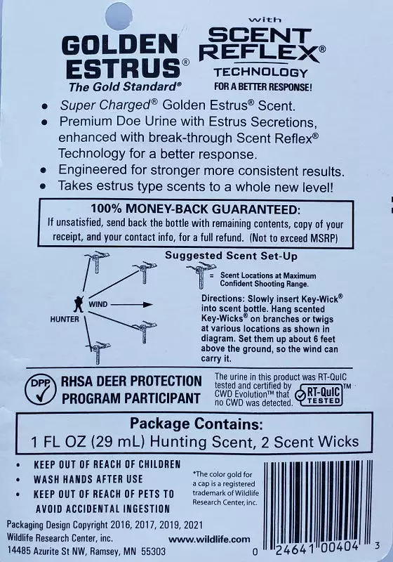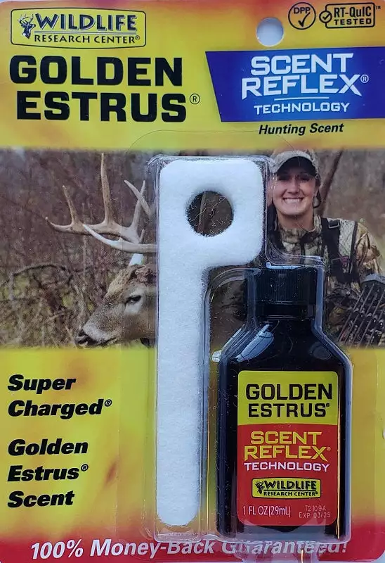 Attract the target near you with this Wildlife Research Center Golden Estrus. Made with estrus secretions, this doe urine is enhanced with Scent Reflex technology for efficient response. It is engineered to deliver consistent results.